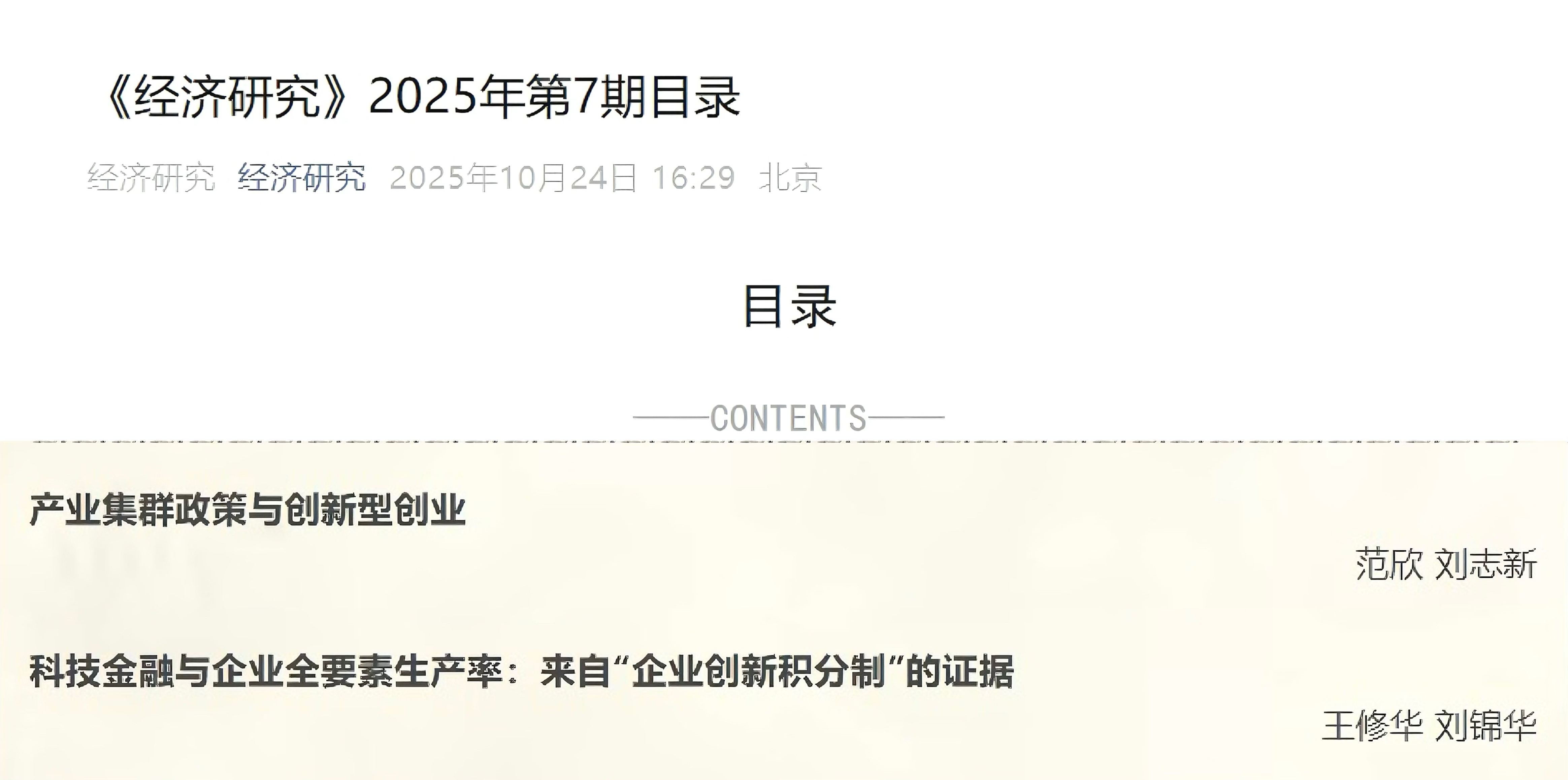 近日,我院应用金融系王修华教授和安徽大学经济娱乐城刘锦华老师(原我院2020级博士研究生)合作的题为“科技金融与企业全要素生产率:来自企业创新积分制的证据”的论文发表在《经济研究》2025年第7期。