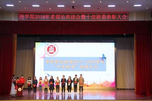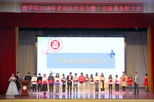 在简洁的活动背景介绍之后,主持人宣读了十佳班委的获奖名单。受表彰的班委们怀着激动而自豪的心情,在热烈的掌声中,有序上台领奖。一阵阵热烈的掌声,一份份鲜红的荣誉证书,都是对他们过去一年中勤勤恳恳的付出的充分肯定。随后,十佳班委代表黄河在讲话中介绍了过去一年中十佳班委为班级和学院付出的努力,肯定了全体班委、干事在学习、工作和生活中的积极作用,讲述了自己在学生干部任职期间的收获与感知,为班级建设提出了许多宝贵的方法建议。(撰稿:李慧、吴文琴审核:张虎)