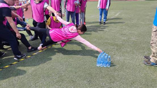 “五星连珠”项目需要每组队员五人一组,背靠背,运送圆球。手挽手、背靠背是给予彼此的信任,拉开手与手之间的距离是给予每个人独立的空间,才能保持团队行稳致远。
