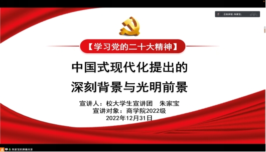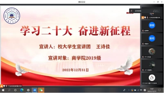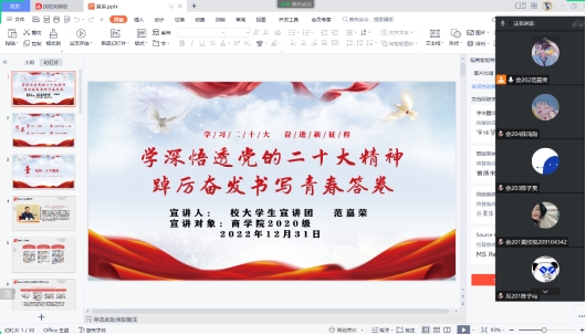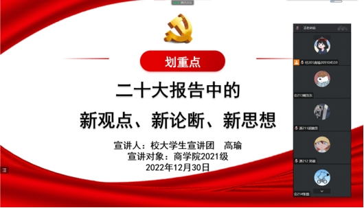 近期以“学习二十大,奋进新征程”为主题开展了党的二十大精神学生宣讲活动。此次宣讲以线上会议形式开展,面向全院基层团组织集中进行,校大学生宣讲团成员结合自身学习体会开展了主题宣讲,用青年的声音将党的二十大精神讲清楚、讲透彻、讲生动。