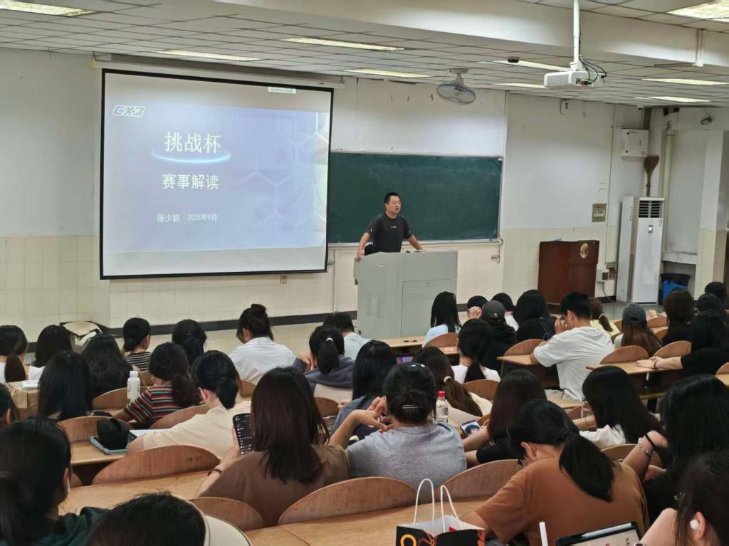 于2025年9月22日,在阶教201举办“挑战杯”宣讲会。本次宣讲会由刘在春老师主持,腾少聪老师主讲,活动顺利举办,共吸引300多名同学参加。