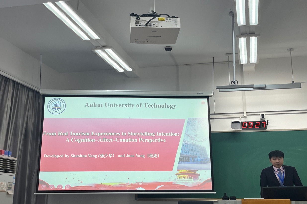 会议期间,杨少华副教授作了题为“红色旅游体验对故事讲述意图的影响:基于认知–情感–意动视角的研究”的学术报告,系统阐述了其在红色旅游与思想政治教育融合研究方面的实践探索,获得与会专家的高度关注。该研究基于认知–情感–意动理论框架,系统探讨了红色旅游体验如何影响游客的故事讲述意图。研究以嘉兴南湖红色旅游地的597名游客为样本进行实证分析,结果表明:感官、真实、共创与新奇体验能够显著增强游客的红色记忆,而红色记忆的提升进一步增强了主观幸福感,从而促进故事讲述意图的形成。其中,感官体验与真实体验是推动红色记忆积累和故事讲述意图增强的关键因素。本研究不仅丰富了红色旅游与故事传播领域的理论成果,也为红色文化的创新表达与传播提供了实践启示,对激发青年一代的红色记忆、增强爱国情怀具有积极意义。