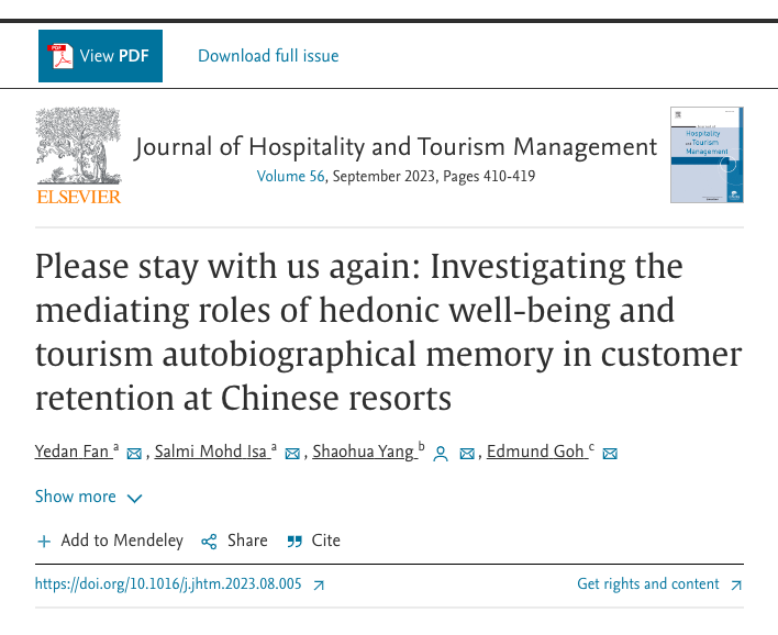 行为科学与政策协同交叉创新团队杨少华副教授,与马来西亚理工大学、澳洲邦德大学研究人员合作,揭示了旅游酒店顾客保留的微观心理规律,相关成果发表在《Journal of Hospitality and Tourism Management》(简称JHTM)。JHTM是澳大利亚旅游与旅游教育委员会的官方杂志,旅游与休闲管理学科的国际权威学术期刊。该期刊是SSCI一区最新影响因子为8.3,在ABDC国际期刊排名A类。娱乐城