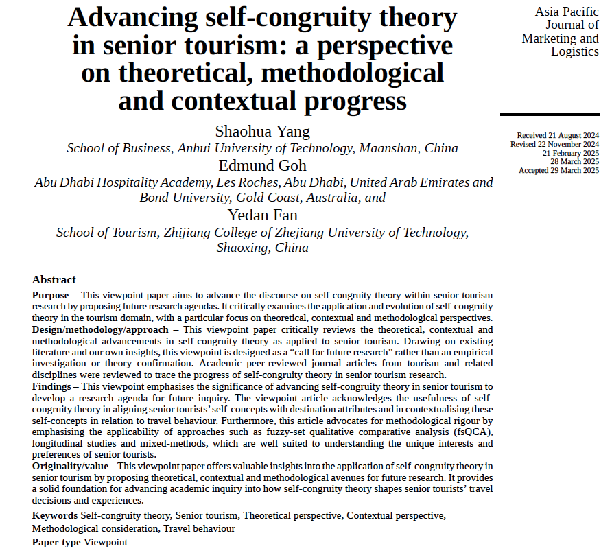 杨少华副教授在国际高水平学术期刊《Asia Pacific Journal of Marketing and Logistics》(简称APJML,中文名《亚太营销与物流杂志》)发表题为《Advancing Self-Congruity Theory in Senior Tourism: A Perspective on Theoretical, Methodological, and Contextual Progress》的观点性论文。观点性论文不同于传统的实证研究,通常不依赖实地调查或数据分析,而是基于作者独特的学术视角、理论思考以及对特定现象的深入洞察,旨在提出新的研究议题,或对既有理论与实践进行批判性分析与创新性阐释。