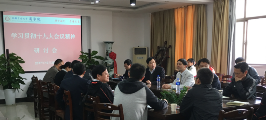 在汇文楼B304召开学习贯彻党的十九大精神研讨会。会议由执行院长洪功翔主持,领导班子成员、各系主任,拟申报2018年国家自科、国家社科和教育部课题的老师,智库建设相关的老师们参加了会议。