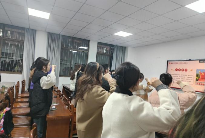 在肖梦雨老师的带领下,全体党员集体肃立,紧握右拳,目光专注,面对鲜艳的党旗,重温入党誓词。铿锵有力的誓词,句句千钧,字字扣心,唤醒了全体党员的责任意识和使命意识,大家以坚定有力的宣誓声,表达着不忘光辉历程、牢记初心使命、坚定跟党走的信心和决心。