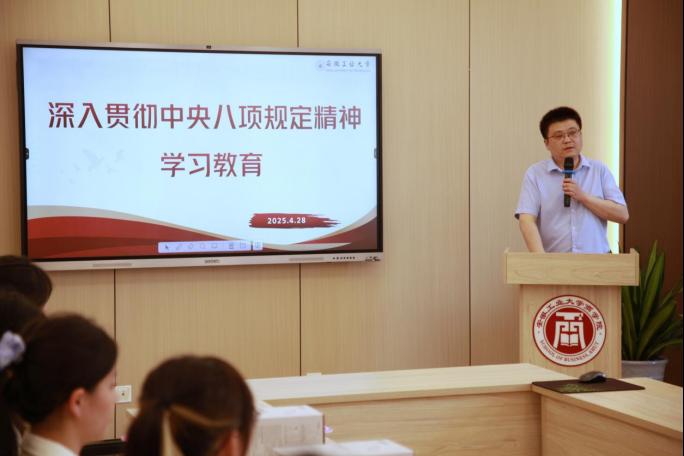 随后,蒋磊结合具体案例,详细解读了中央八项规定精神的核心内容。对于如何深入贯彻中央八项规定精神学习教育,他提出四点“确保”:一是确保学习质量,原原本本学习规定内容,深刻领会精神实质,做到学深悟透、融会贯通;二是确保查摆力度,不仅要对自身的作风问题进行深刻反思和自查自纠,还要及时发现并纠正身边的不良现象;三是确保取得成效,要将学习成果切实转化为改进工作作风的有力举措,以实际行动践行中央八项规定精神;四是确保发挥先锋模范作用,党员同志要以身作则,率先垂范,以自身的良好形象带动全体同学,共同营造风清气正、积极向上的校园环境。