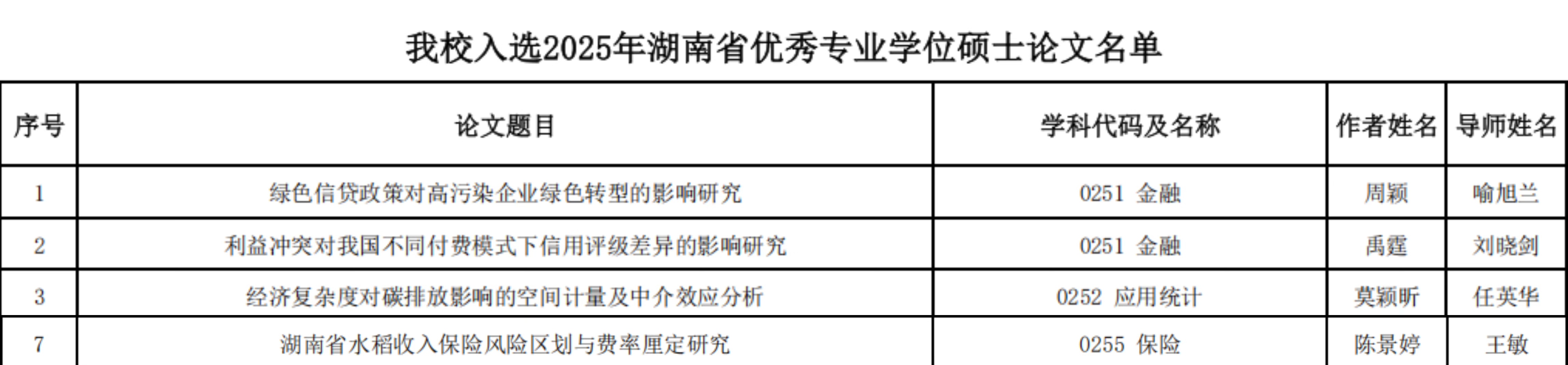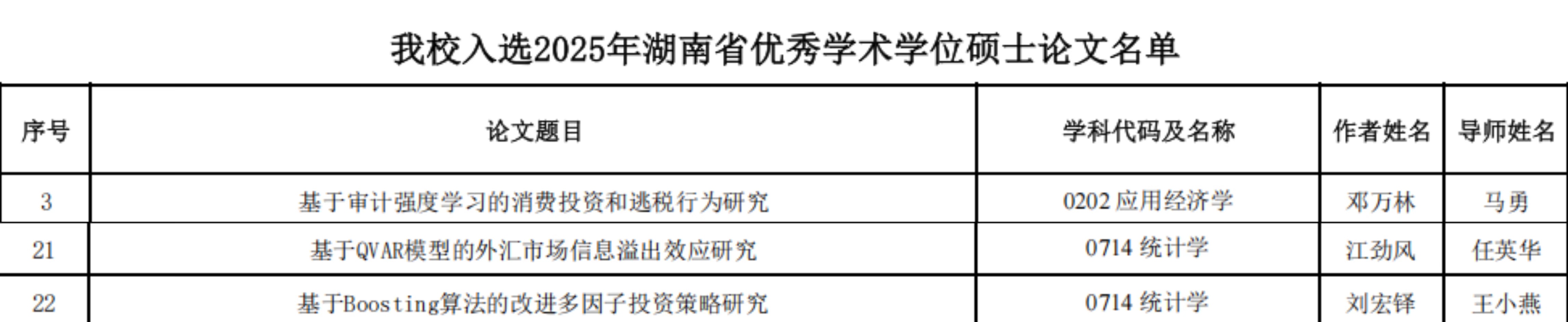 近日,湖南省教育厅公布了2025年湖南省优秀硕士学位论文名单,我院共有7篇论文入选湖南省优秀硕士学位论文,这7篇论文分别由我院马勇老师、任英华老师、王小燕老师、喻旭兰老师、刘晓剑老师、王敏老师指导。