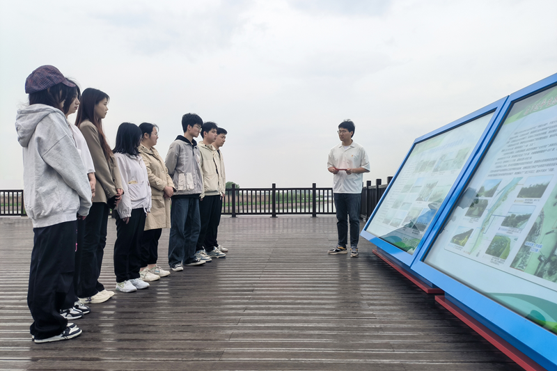 学生代表们来到了长江边的观景平台,老师向大家讲述了薛家洼翻天覆地的变化,同学们通过映入眼帘鸟飞豚跃的美丽景色,切身实地感受到薛家洼的今昔对比,了解到薛家洼生态园长江岸线综合整治、生态环境保护修复等方面取得的成效。