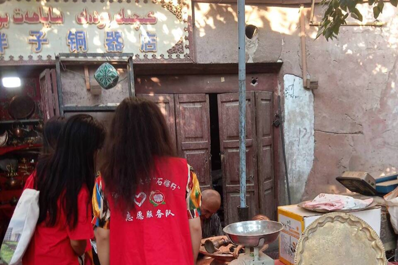 实践队首站走进喀什地区。在库车王府,队员瞻仰爱国王爷护团结的历史足迹,古老建筑让“共同体”意识扎根;漫步喀什古城,特色建筑、砖纹穹顶流淌文化血脉,队员捕捉民族风情。深入民族乐器店,都塔尔等诉说艺术传承;走访铜器店,与匠人对话,探寻传统技艺传承密码,让民族文化“活”在交流里。